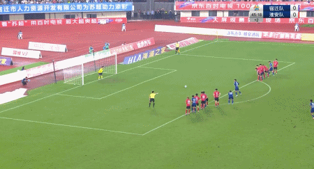 第45+1分钟,胡颢瑀造点,高驰主罚点球命中,宿迁队1-0淮安队