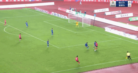 第16分钟,淮安队右路传中险些进球,门将将球单掌拖出