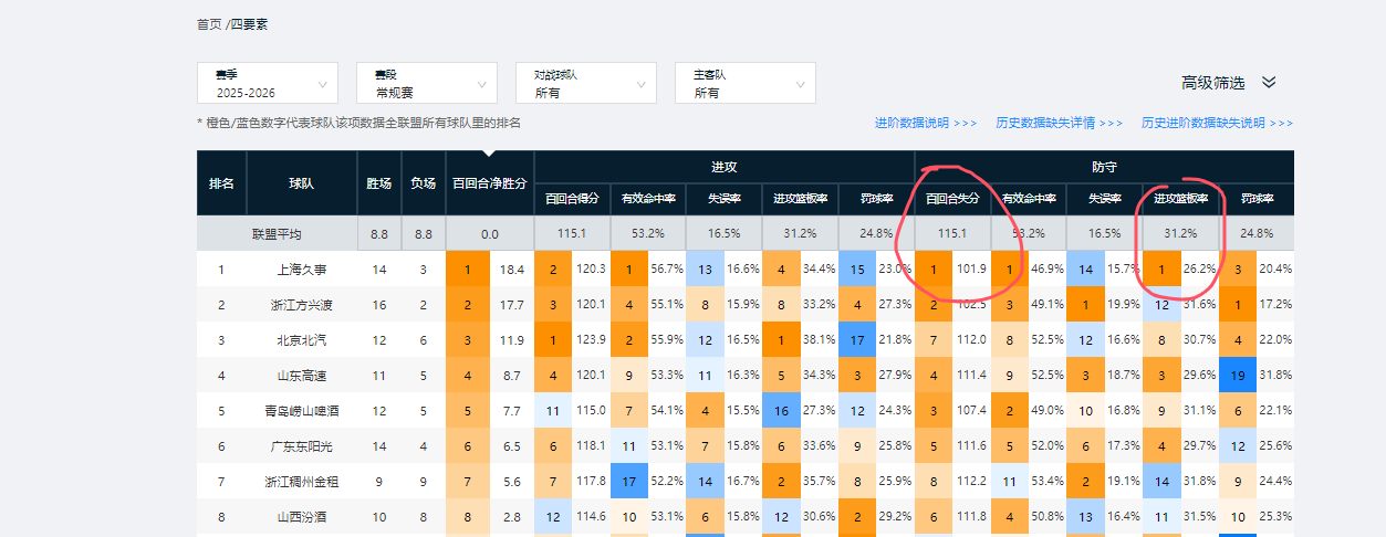 但他们场均可完成4.9次盖帽,该数据联盟第一。高阶数据方面,上海男篮防守端百回合失分101.9,限制对手有效命中率46.9%,限制对手进攻篮板率26.2%,这三项数据暂时均位列联盟第一。可见上海队在干扰对手投篮,护框,篮板球保护等方面做得非常到位。