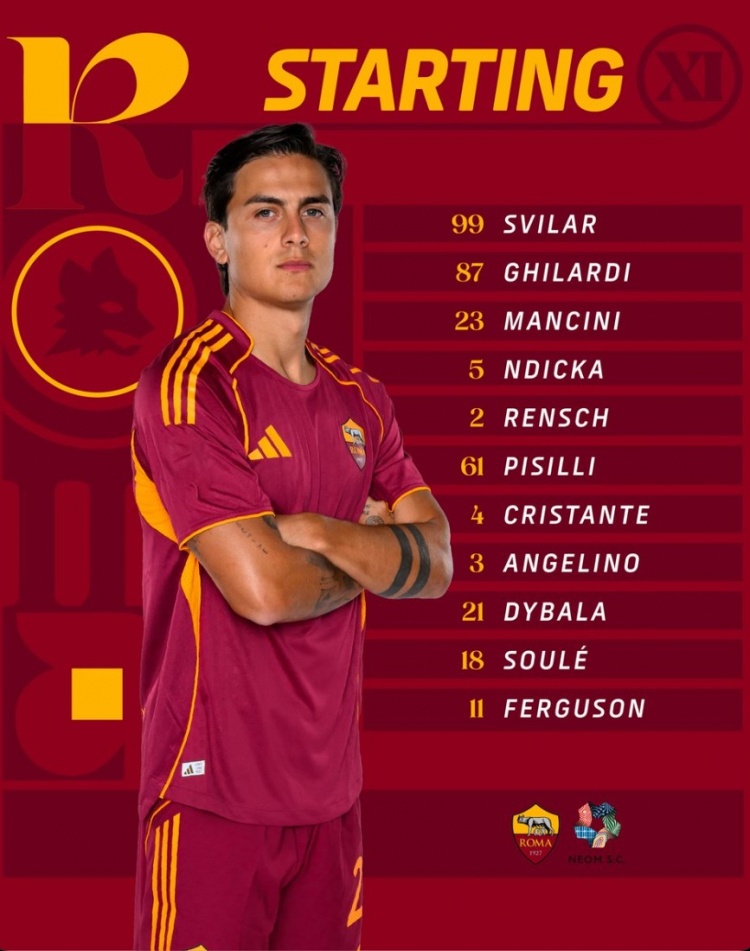 8月16日讯 本周六,罗马将与沙特球队新未来体育进行一场友谊赛,迪巴拉首发出场,苏莱、弗格森、曼奇尼在列。